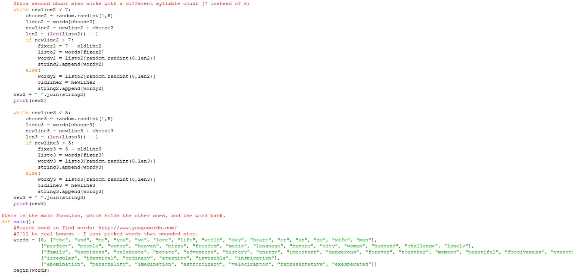 Web Development: Rotary Club of Greater Clark County: Roles: Palette designer, page layout designer, photo editor. Coding: Automatic Haiku Generator: First section of code Second section of code Example of the program’s function Roles: Coder (done in Python 3.5.1).