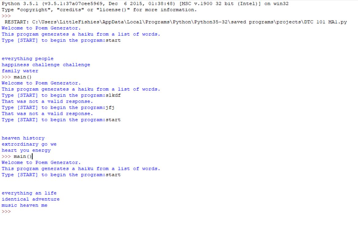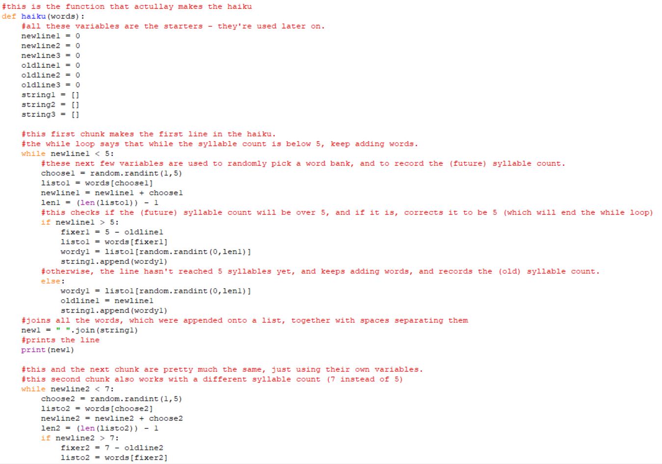 Web Development: Rotary Club of Greater Clark County: Roles: Palette designer, page layout designer, photo editor. Coding: Automatic Haiku Generator: First section of code Second section of code Example of the program’s function Roles: Coder (done in Python 3.5.1).